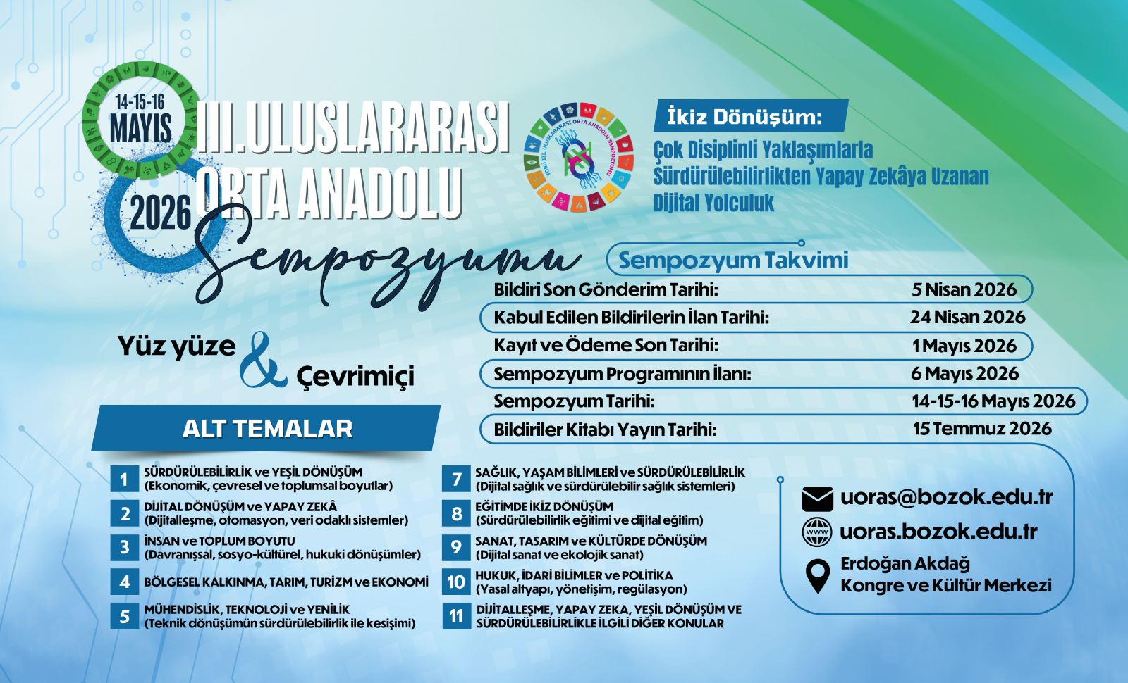 Değerli Bilim İnsanları, Akademisyenler, Araştırmacılar ve Uygulayıcılar, Yozgat Bozok Üniversitesi ev sahipliğinde düzenlenecek olan III. Uluslararası Orta Anadolu Sempozyumu (UORAS-III)’na sizleri içtenlikle davet etmekten onur duyuyorum. Sempozyumumuz, 14–15–16 Mayıs 2026 tarihlerinde Yozgat’ta; bilimin birleştirici gücüyle, günümüzün en kritik iki dönüşüm hattını aynı zeminde buluşturmak üzere gerçekleştirilecektir. Bu yılki ana temamızı, çağımızın yönünü belirleyen iki büyük hareketin kesişiminde konumlandırdık: “İkiz Dönüşüm: Çok Disiplinli Yaklaşımlarla Sürdürülebilirlikten Yapay Zekâya Uzanan Dijital Yolculuk” Bu tema, bir yandan sürdürülebilirlik ve yeşil dönüşümün çevresel, toplumsal ve ekonomik gerekliliklerini; diğer yandan dijital dönüşüm ve yapay zekânın dönüştürücü etkisini birlikte ele almayı amaçlamaktadır. UORAS-III, yalnızca sorunları tartışan değil; çözüm üreten, yöntem geliştiren, iyi örnekleri görünür kılan ve farklı disiplinlerden beslenen bir bilimsel etkileşim platformu olmayı hedeflemektedir. Sempozyum kapsamında, çalışmalarınızı özet ya da tam metin formatında sunarak başvuruda bulunabilirsiniz. Gönderilen bildiriler hakem değerlendirmesine tabi tutulacak; kabul edilen çalışmalar, sempozyum sürecinin akademik çıktısı olarak bildiri kitabında yayımlanacaktır. Bilimsel katkılarınızı ulusal ve uluslararası ölçekte paylaşabileceğiniz; alanında uzman akademik çevrelerle yeni iş birlikleri kurabileceğiniz nitelikli bir tartışma zemini sunmayı önemsiyoruz. UORAS-III; ana tema çerçevesinde, aşağıdaki başlıklar başta olmak üzere ikiz dönüşümle ilişkilendirilebilecek tüm disiplinlerden çalışmalara açıktır: • Sürdürülebilirlik ve Yeşil Dönüşüm (iklim, enerji, döngüsel ekonomi, sürdürülebilir üretim-tüketim, çevresel politikalar vb.) • Dijital Dönüşüm ve Yapay Zekâ (veri odaklı sistemler, akıllı uygulamalar, endüstri dönüşümü, yapay zekâ etiği ve yönetişimi vb.) • İnsan ve Toplum Boyutu (toplumsal dönüşüm, davranış değişimi, etik, kapsayıcılık, dijital toplum, iyi oluş vb.) • Bölgesel Kalkınma, Tarım, Turizm ve Ekonomi (yerel kalkınma, akıllı tarım, sürdürülebilir turizm, yeşil ekonomi vb.) • Mühendislik, Teknoloji ve Yenilik (sürdürülebilir tasarım, yeni malzemeler, temiz teknolojiler, inovasyon ekosistemleri vb.) • Sağlık, Yaşam Bilimleri ve Sürdürülebilirlik (dijital sağlık, dayanıklılık, sürdürülebilir sağlık modelleri vb.) • Eğitimde İkiz Dönüşüm (dijital pedagojiler, sürdürülebilirlik okuryazarlığı, eğitim teknolojileri vb.) • Sanat, Tasarım ve Kültürde Dönüşüm (kültürel miras, sürdürülebilir tasarım, dijital kültür ve yaratıcı endüstriler vb.) • Hukuk, İdari Bilimler ve Politika (düzenlemeler, yönetişim, kamu politikaları, etik ve risk yönetimi vb.) • İkiz dönüşüm ekseninde diğer disiplinler arası çalışmalar Sempozyumumuz, katılımcılar için yüz yüze ve çevrim içi sunum seçeneklerini bir arada sunarak erişilebilirliği artırmayı; farklı şehirlerden ve ülkelerden katkıları aynı akademik atmosferde buluşturmayı hedeflemektedir. Bilimsel birikiminizi, özgün araştırmalarınızı ve yenilikçi önerilerinizi UORAS-III çatısı altında paylaşmanız, ikiz dönüşümün bilimsel altyapısını güçlendirecek; sürdürülebilir ve dijital geleceğin birlikte tasarlanmasına önemli katkılar sağlayacaktır. Başvuru takvimi, alt temalar, katılım koşulları, ücretler ve oturum formatlarına ilişkin tüm güncel bilgilere sempozyumun resmî web sitesi üzerinden ulaşabilirsiniz: uoras.bozok.edu.tr. Sizleri UORAS-III’te aramızda görmekten büyük mutluluk duyacağız. 14–15–16 Mayıs 2026 tarihlerinde Yozgat’ta buluşmak dileğiyle, saygılarımla.